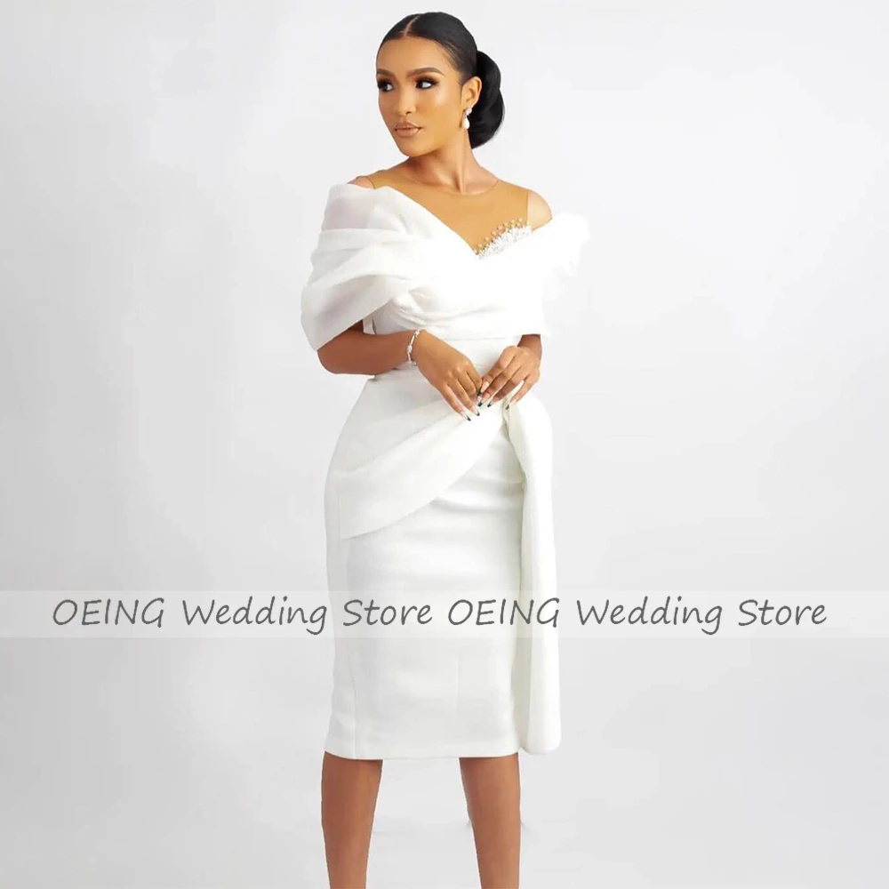 Short Wedding Dress White Off the Shoulder Sheath/Column Wedding Gown for Women 2023 Bride Knee Length Beaded Simple Bridal Gown