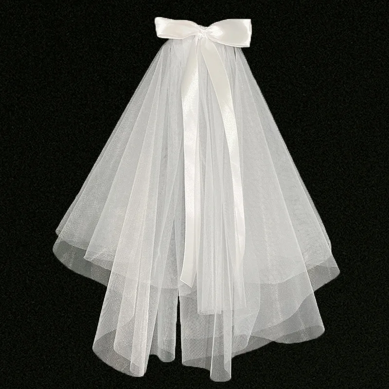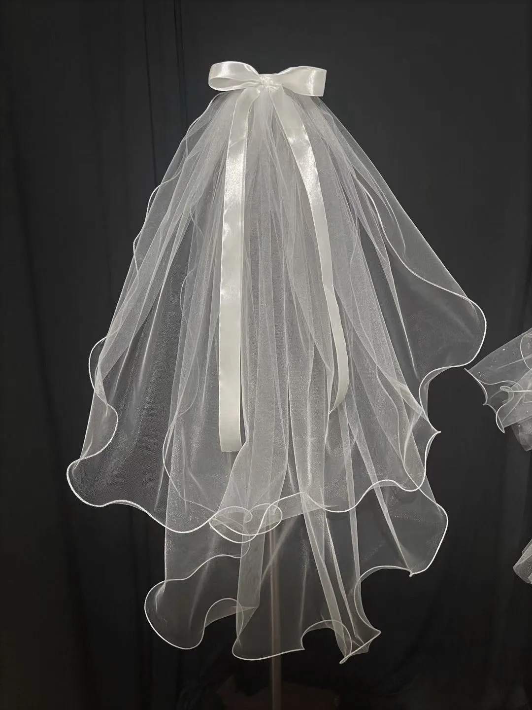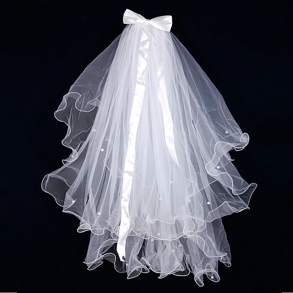 Short Wedding Veil With Comb Bow Pearls 2 Layers Simple Bridal Mariage Accessories 2024