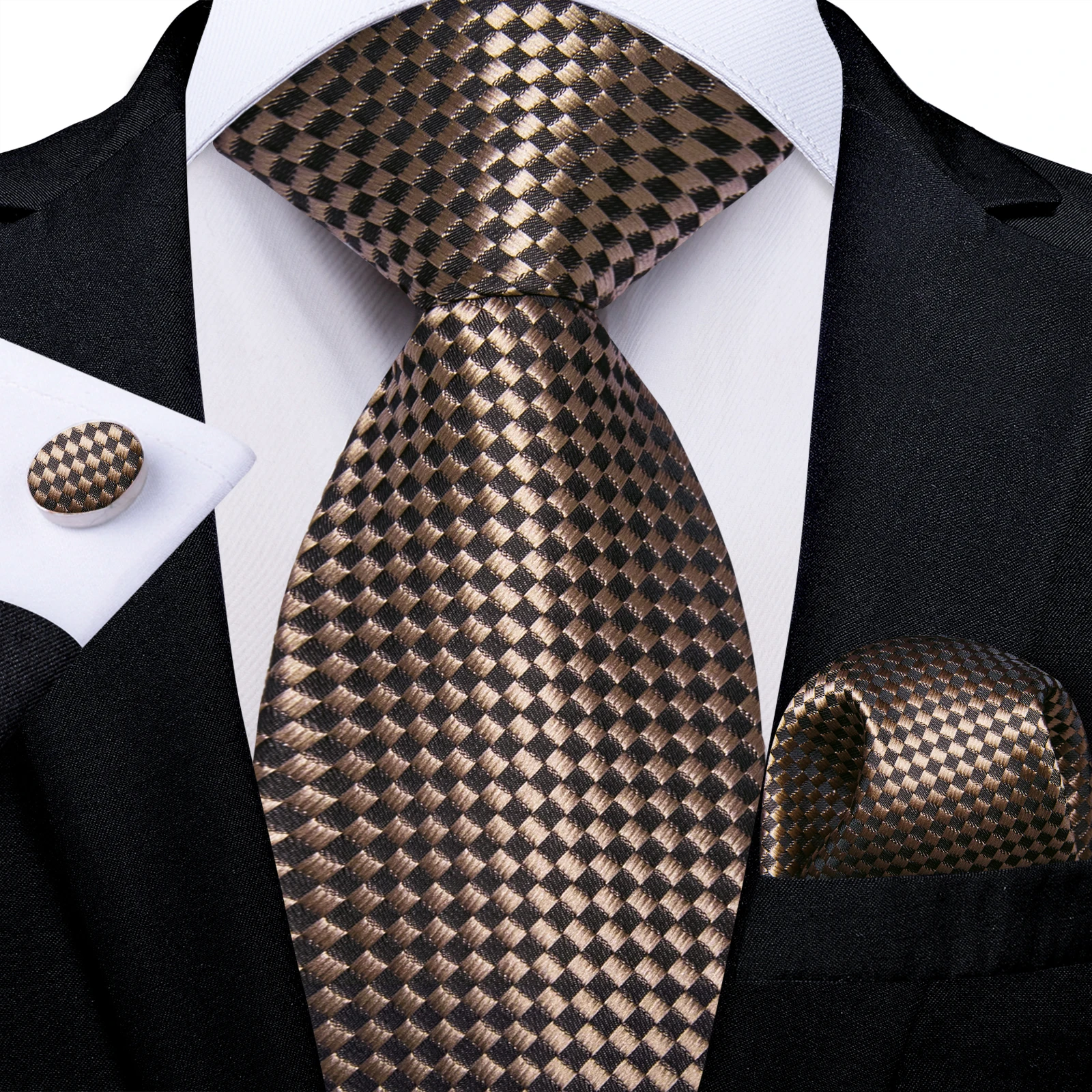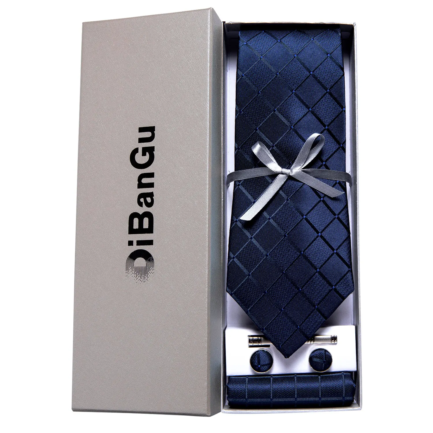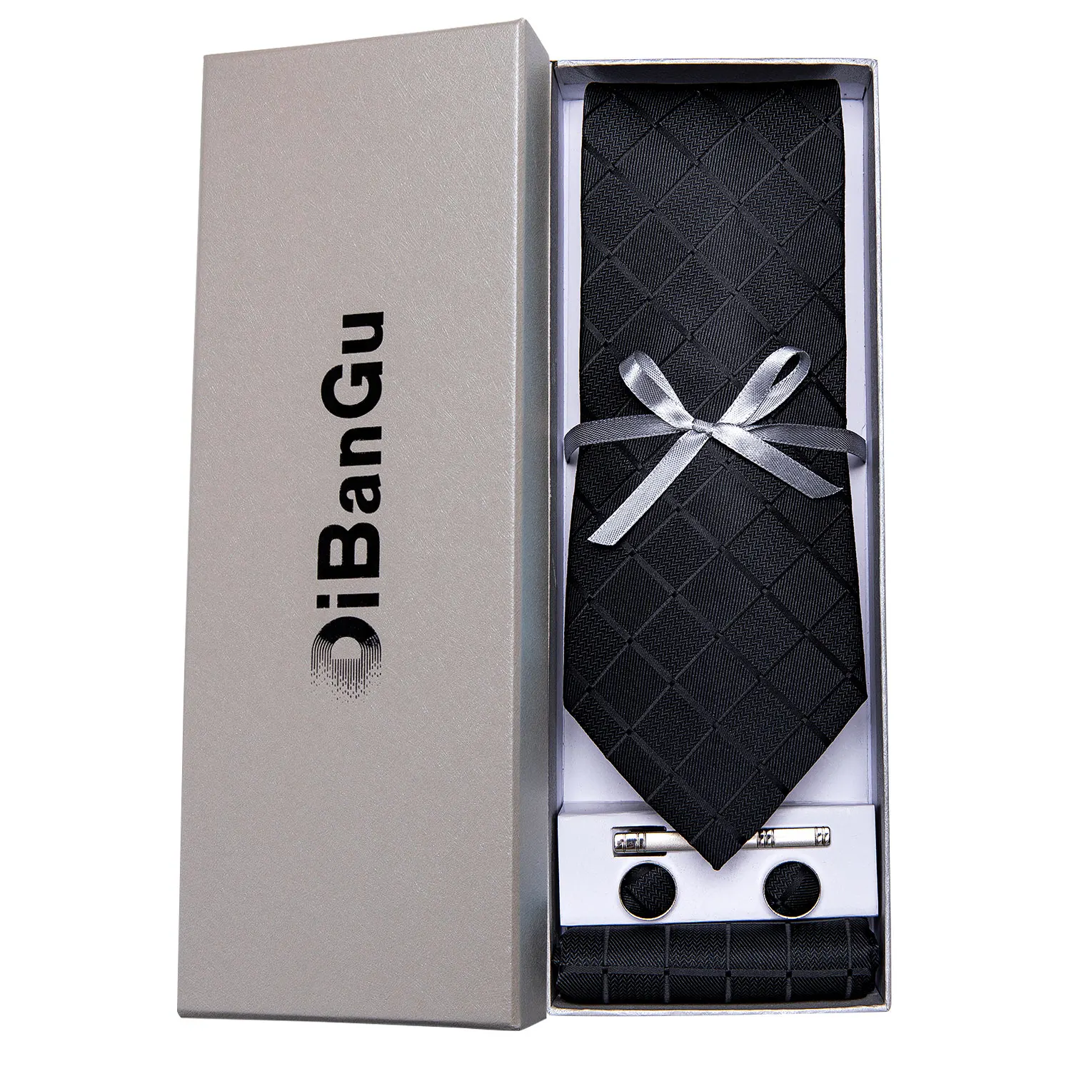 Solid Black Plaid Men's 8cm Polyester Neck Tie Handkerchief Cufflinks Set with Gift Box Tie Clip Birthday Anniversary Gift