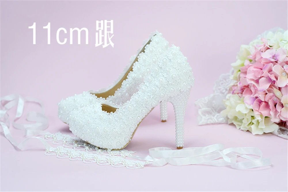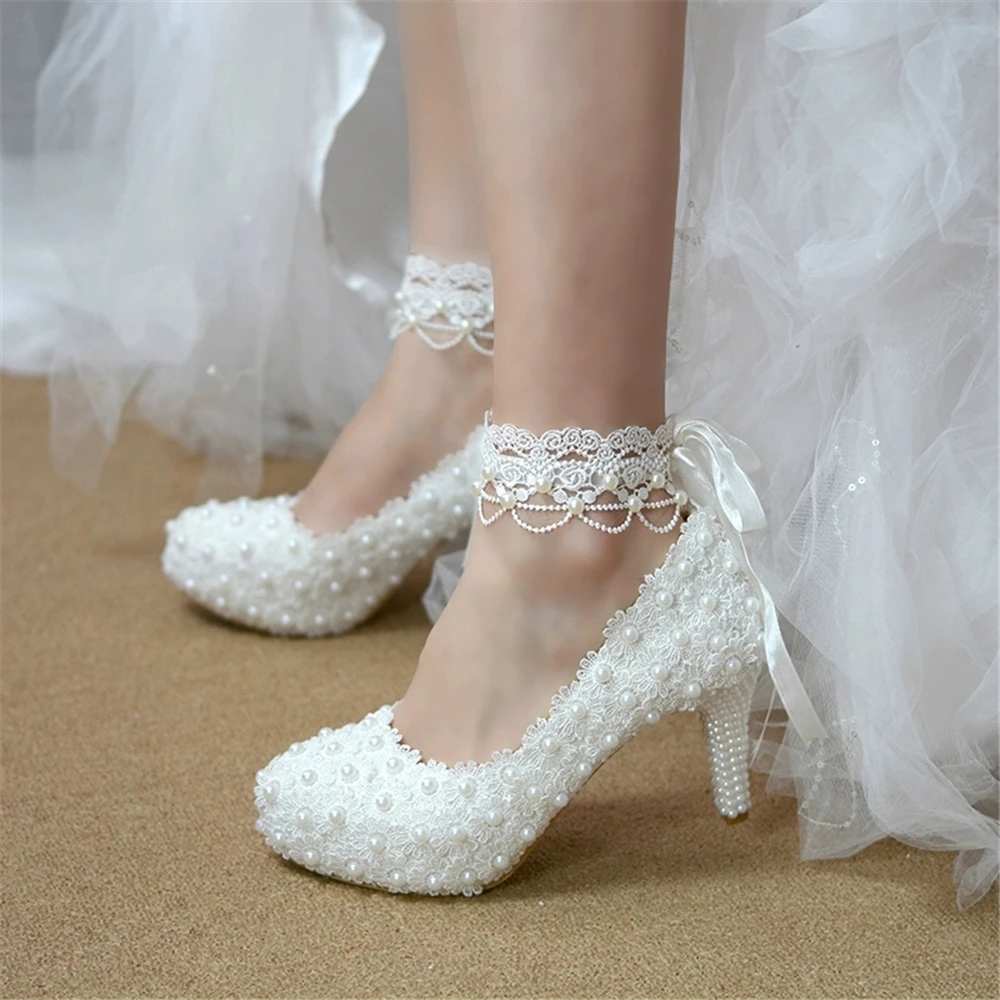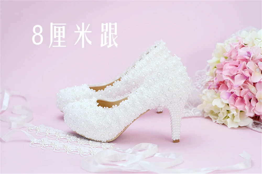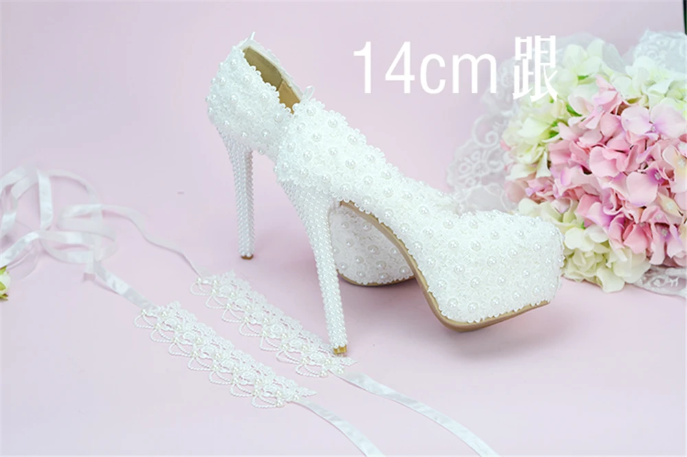 Spring round head shallow pearl lace with waterproof platform wedding shoes thin high-heeled banquet dress large size women shoe