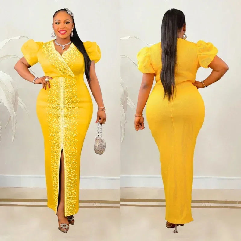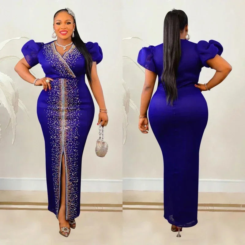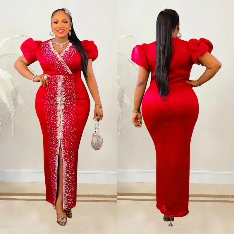 Summer Fashion Bubble Sleeve Diamond Evening Dress African Fashion Women High Street V-neck Slim Split Wedding Party Dress Women