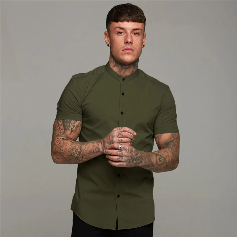 Summer Fashion Short Sleeve Shirt Men Slim Fit Social Business Stand Collar Dress Shirt Brand Mens Fitness Sports Gym Clothing