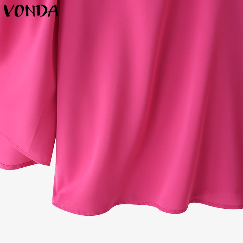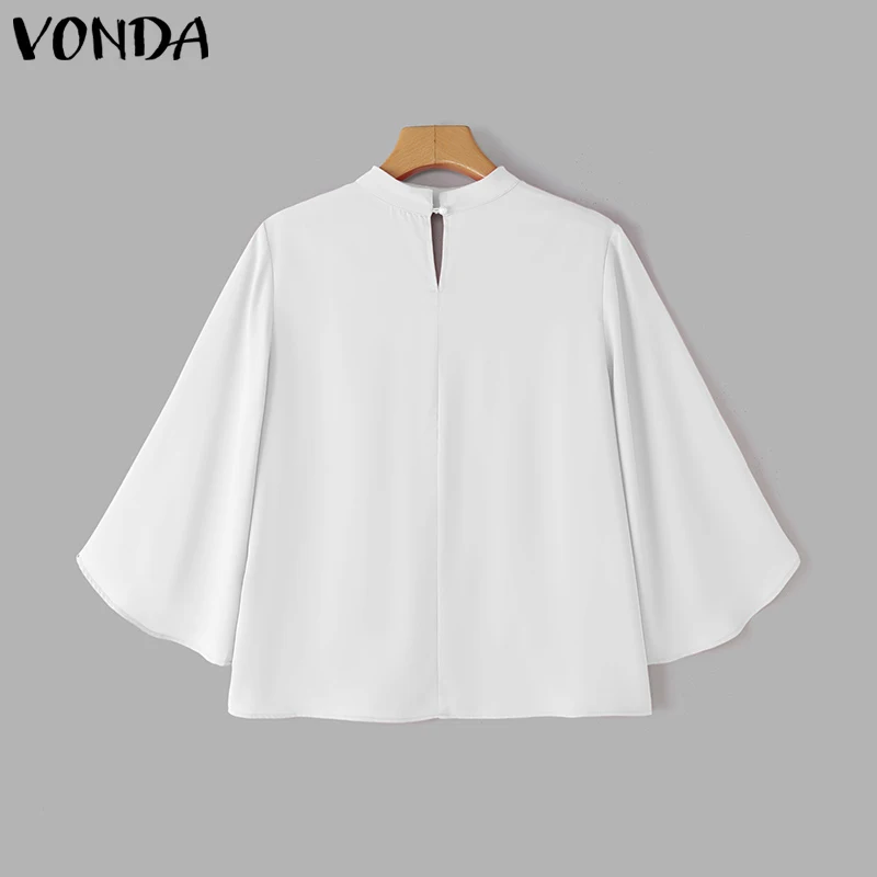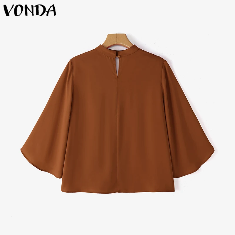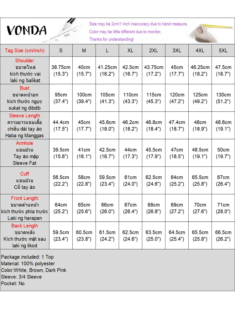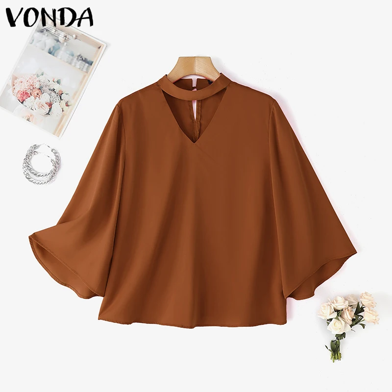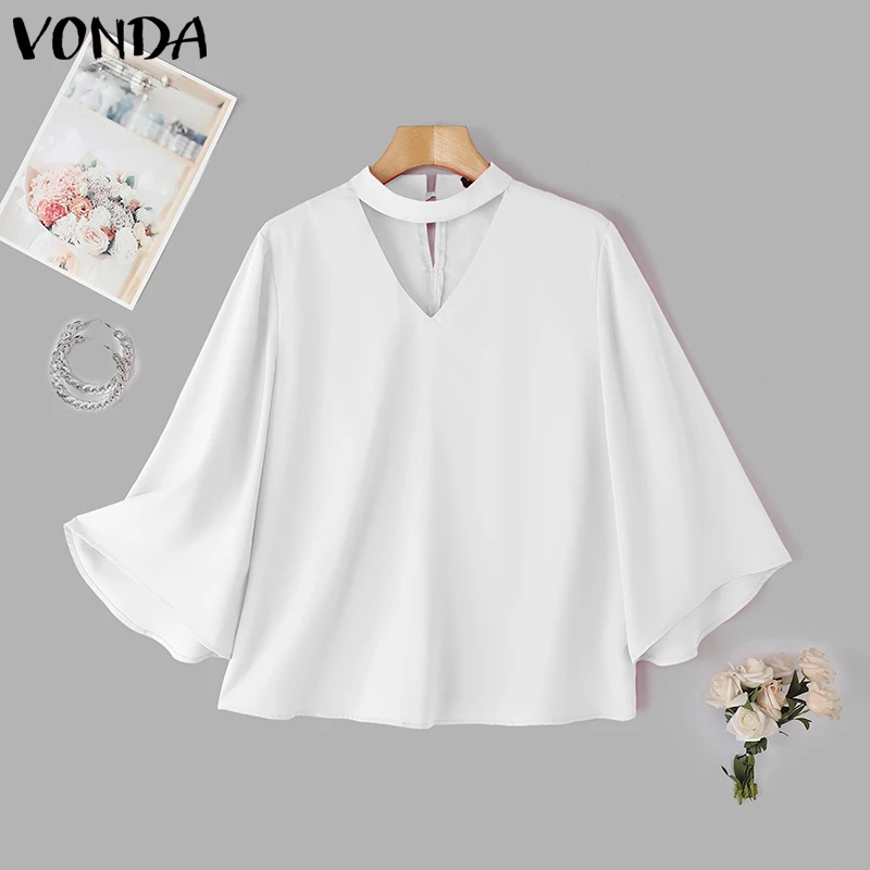 VONDA Plus Size Fashion Blouse Women Elegant OL Shirts Casual Hollow Out V Neck Solid Color Tunic Tops 3/4 Sleeve Blusas 5XL