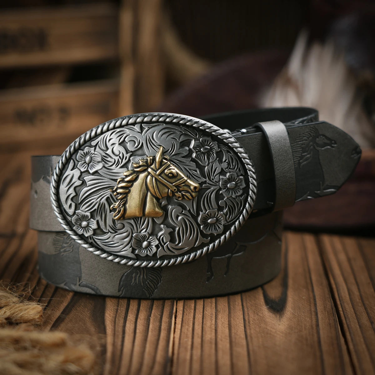 Western Cowboy Leather Buckle Belts Horse Pattern Floral Engraved Buckle Belt for Men