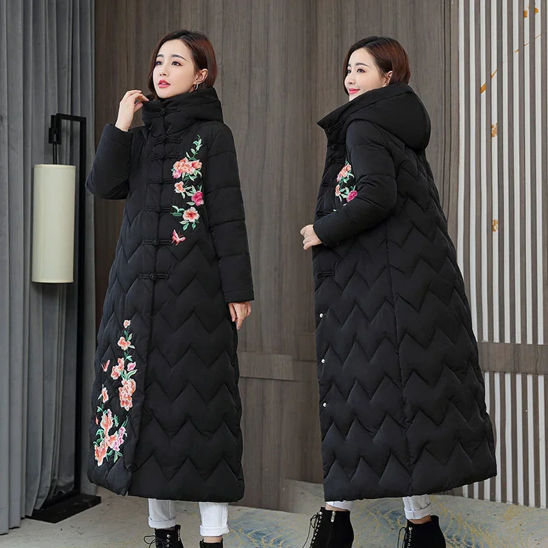 Winter Down Cotton Padded Women Chinese National Style Embroidered Long Outwear Thickened Warm Hooded Parkas Coat Female