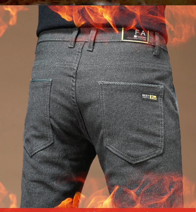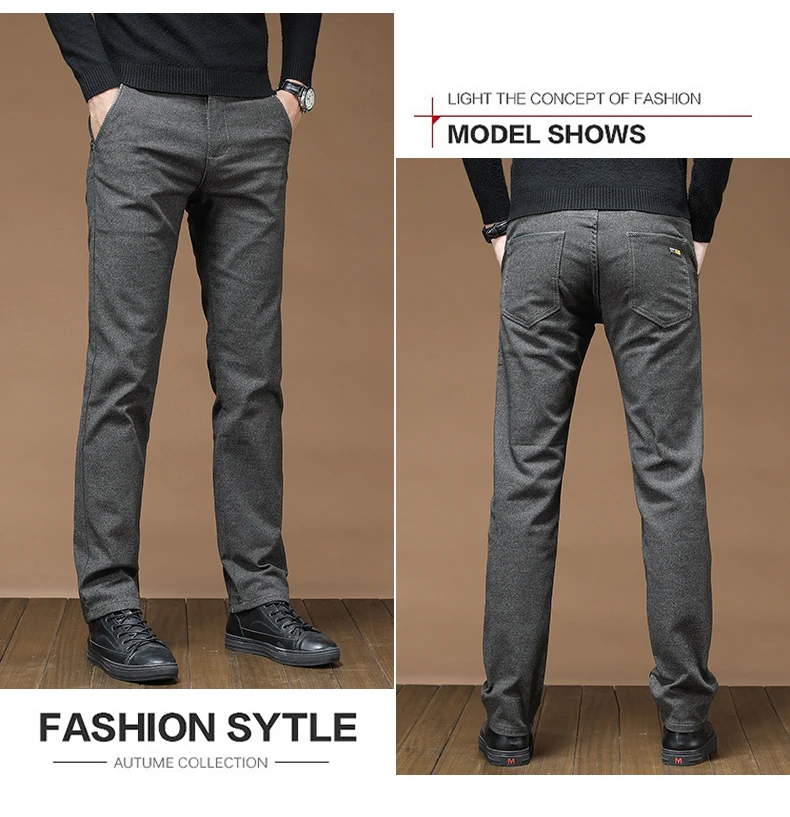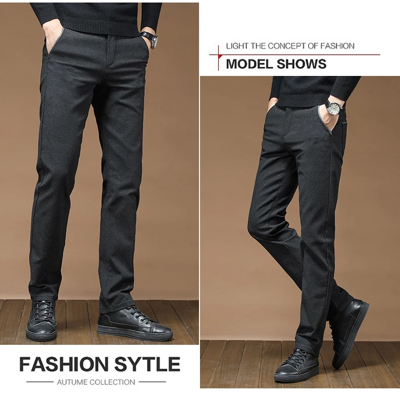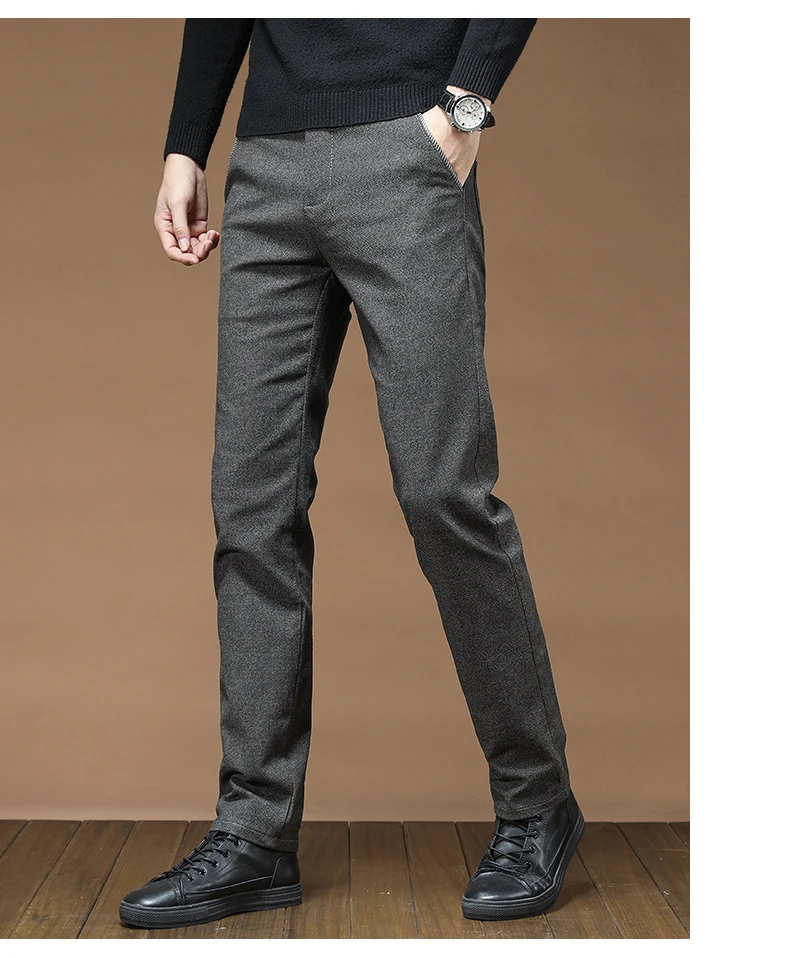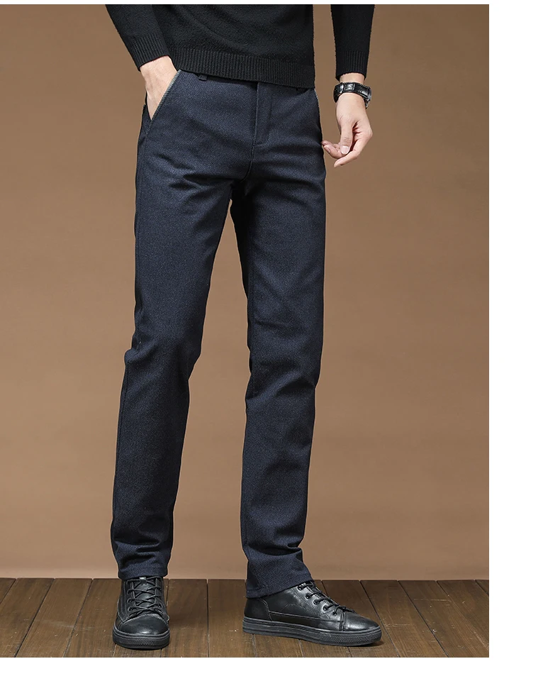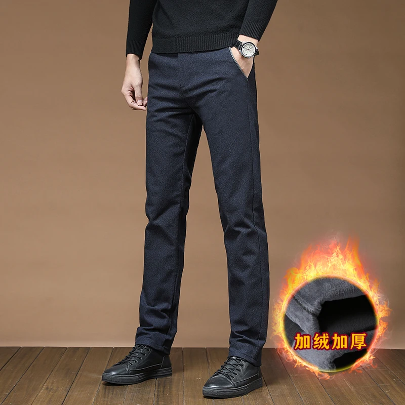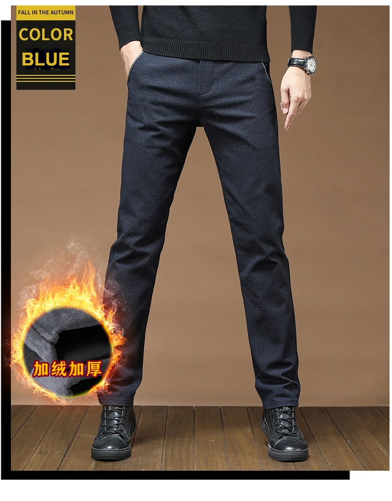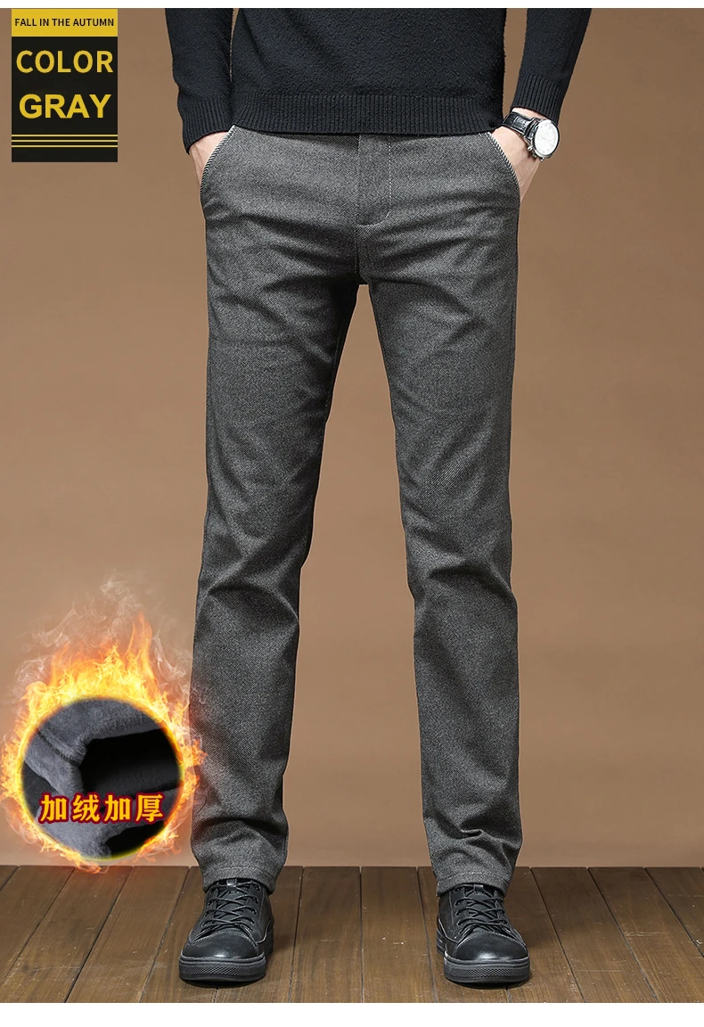 Winter Fashion Thermal Mens Casual Pants Fleece Lined Straight Business Trousers Versatile Black Gray Blue Brand Trousers