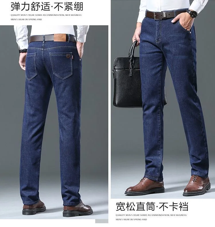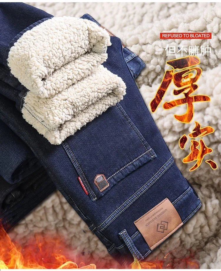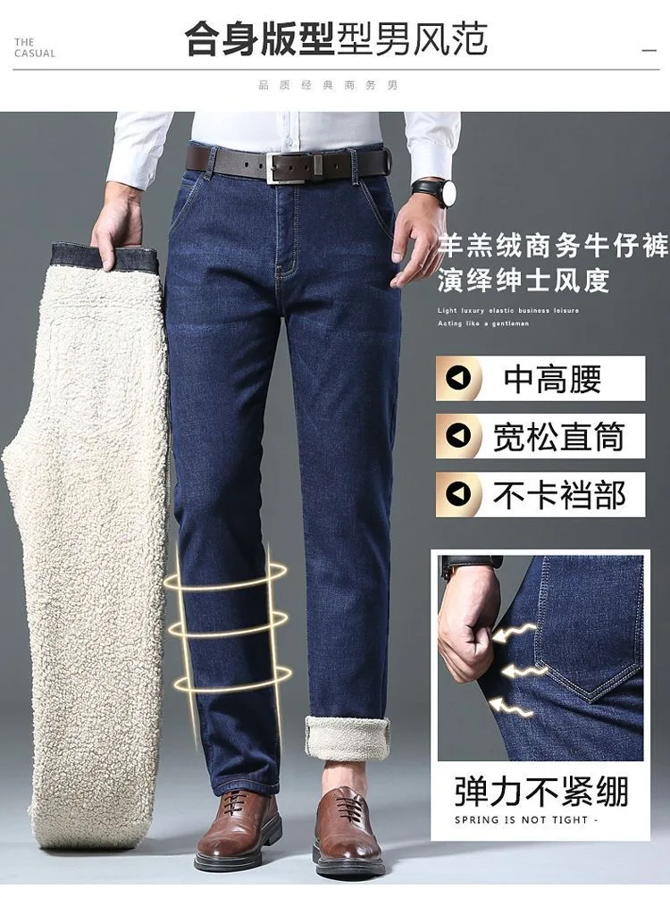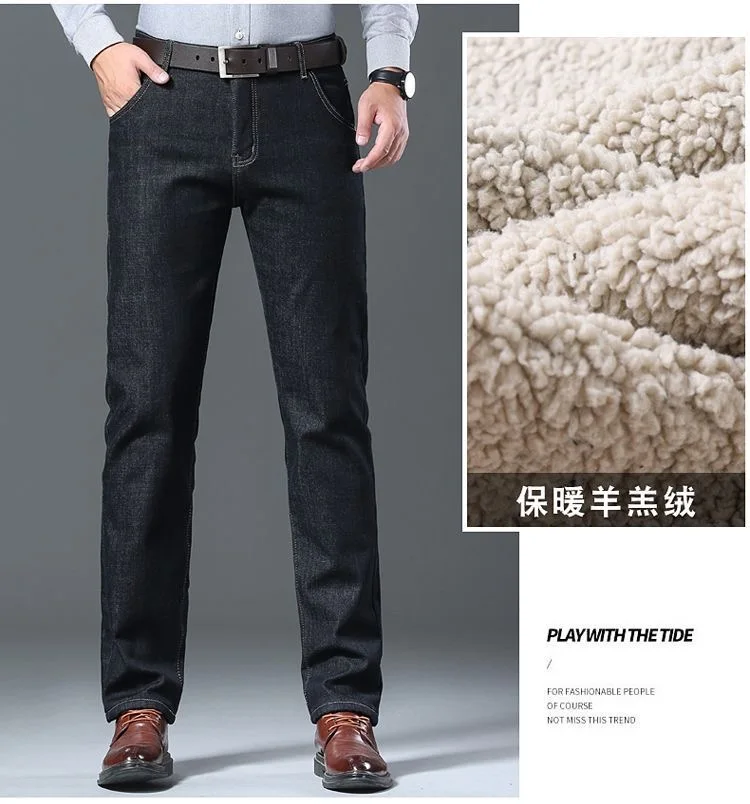 Winter New Fashion Trend Solid Color Plus Plush Thick Warm Jeans For Men's Casual Loose Sports Straight Leg Elastic Jeans 28-40