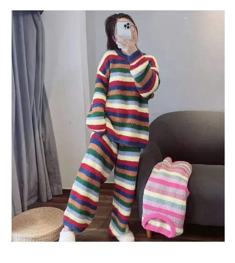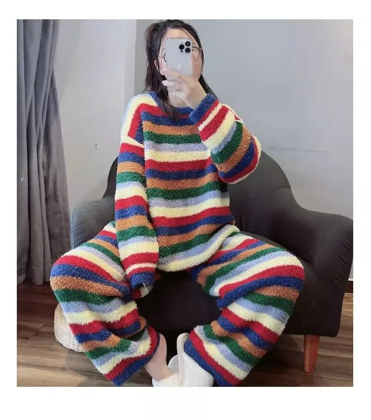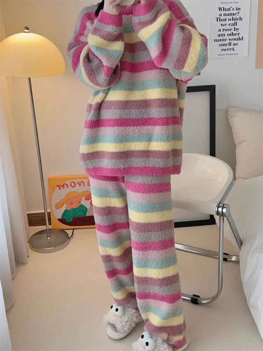 Winter Pajamas for Women: Cute Rainbow Pattern Korean Style Simple Half-Fleece Warm Pajamas Homewear Women's Winter Set