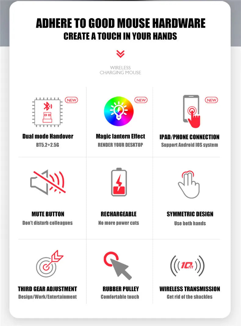 • Rechargeable Battery :The wireless mouse is powered by a rechargeable battery, ensuring long-lasting use and reducing the need for frequent charging.