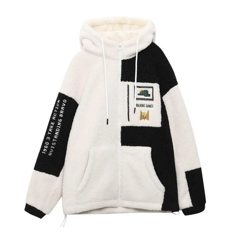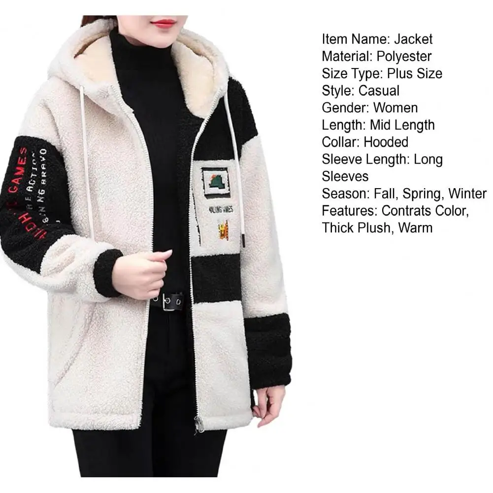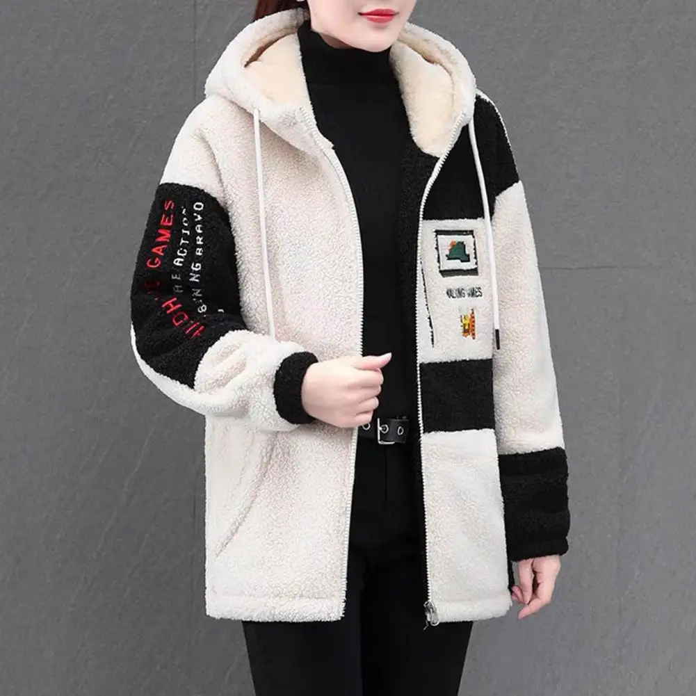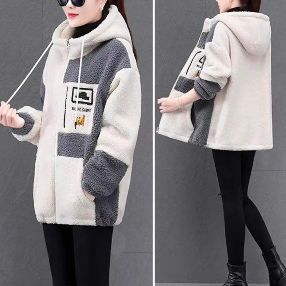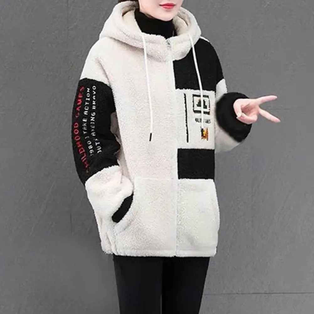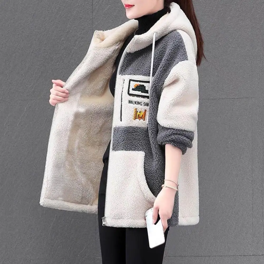 Women Autumn Winter Jacket Hooded Colorblock Thick Plush Long Sleeve Letter Embroidery Drawstring Cardigan Lady Mid Length Coat