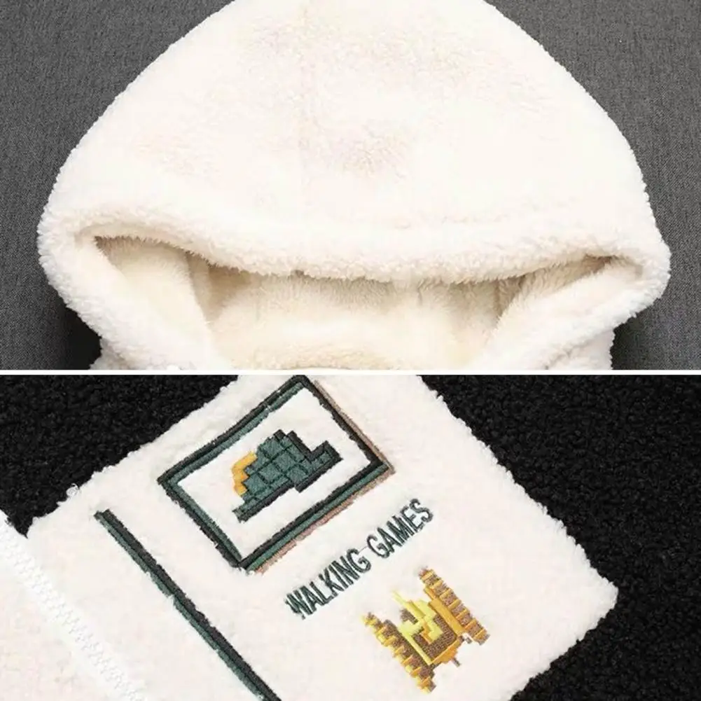 Women Fall Winter Jacket Hooded Colorblock Thick Plush Long Sleeve Letter Embroidery Drawstring Soft Cozy Zipper Cosure Cardigan Lady Mid Length Coat