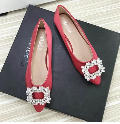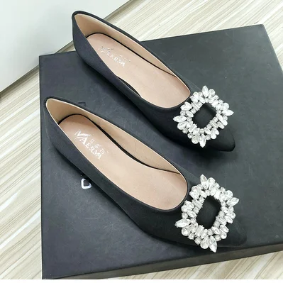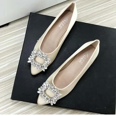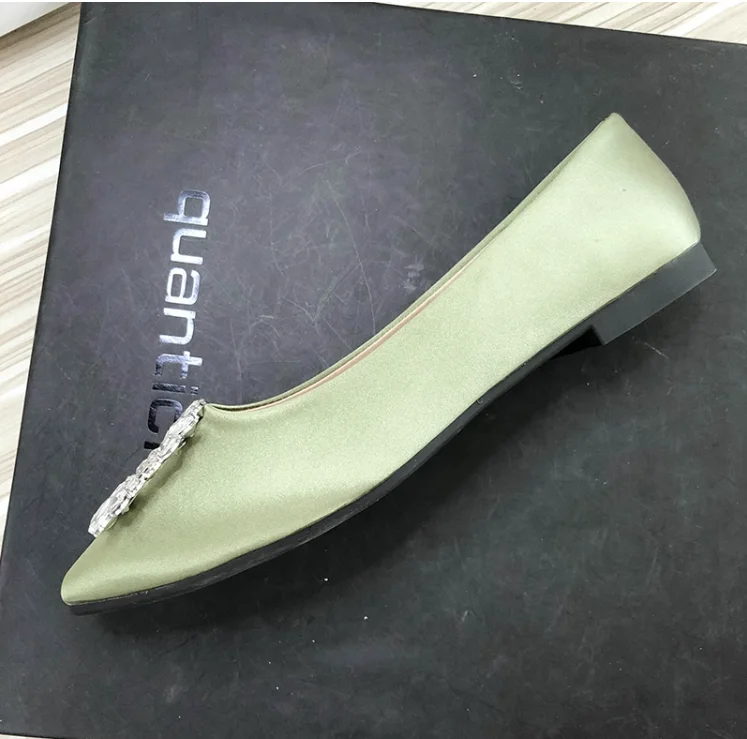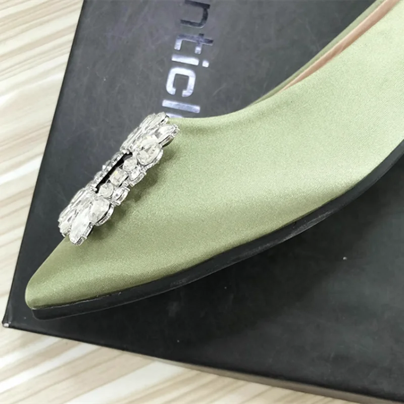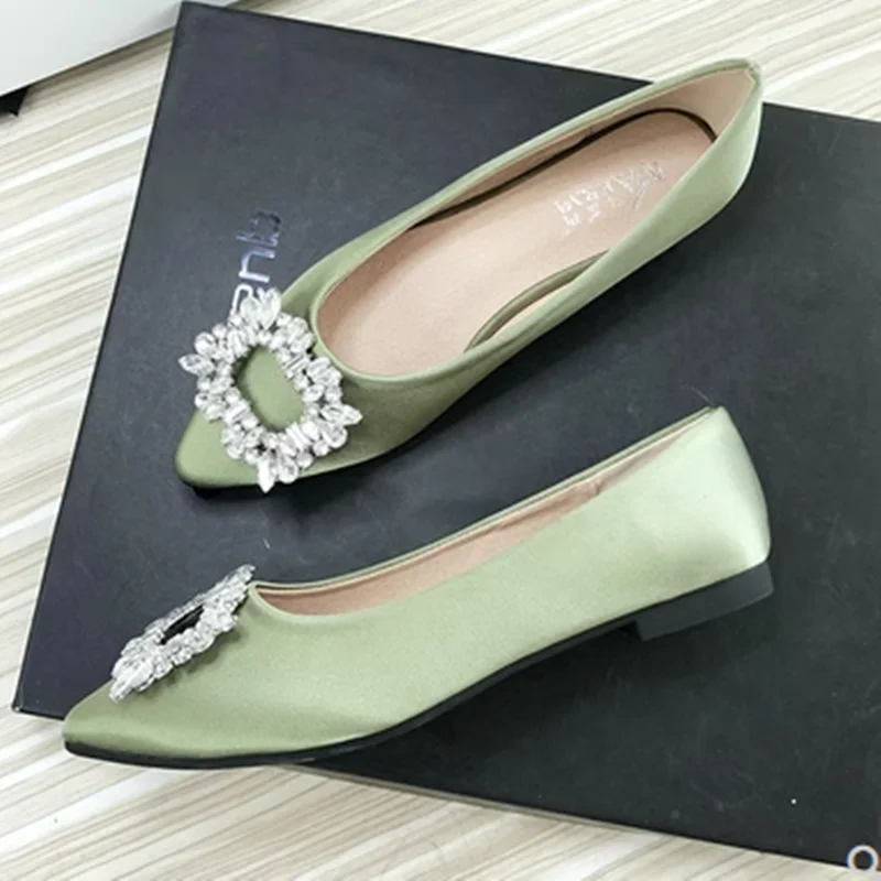 Women Green Blue Shoes Silk Null Plain Flats Pointed Toe Slip-On With Crystal Buckle Shallow Mouth Cute Retro Tacons 32-48 28cm