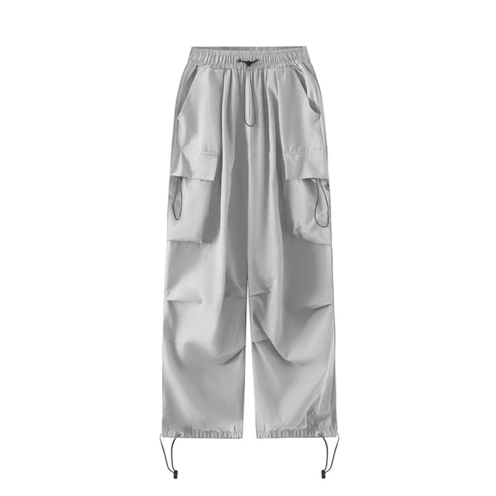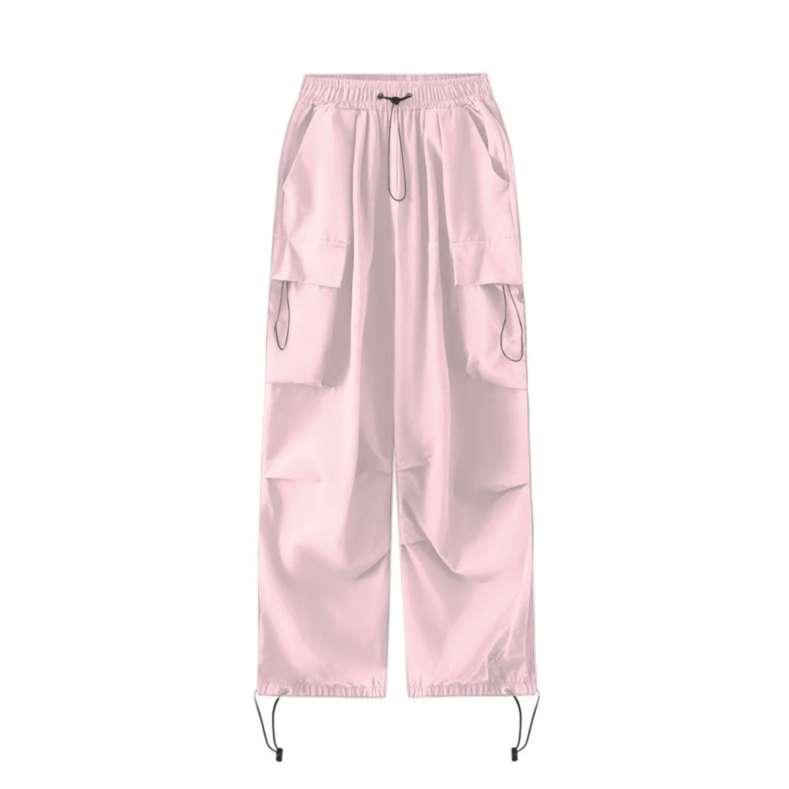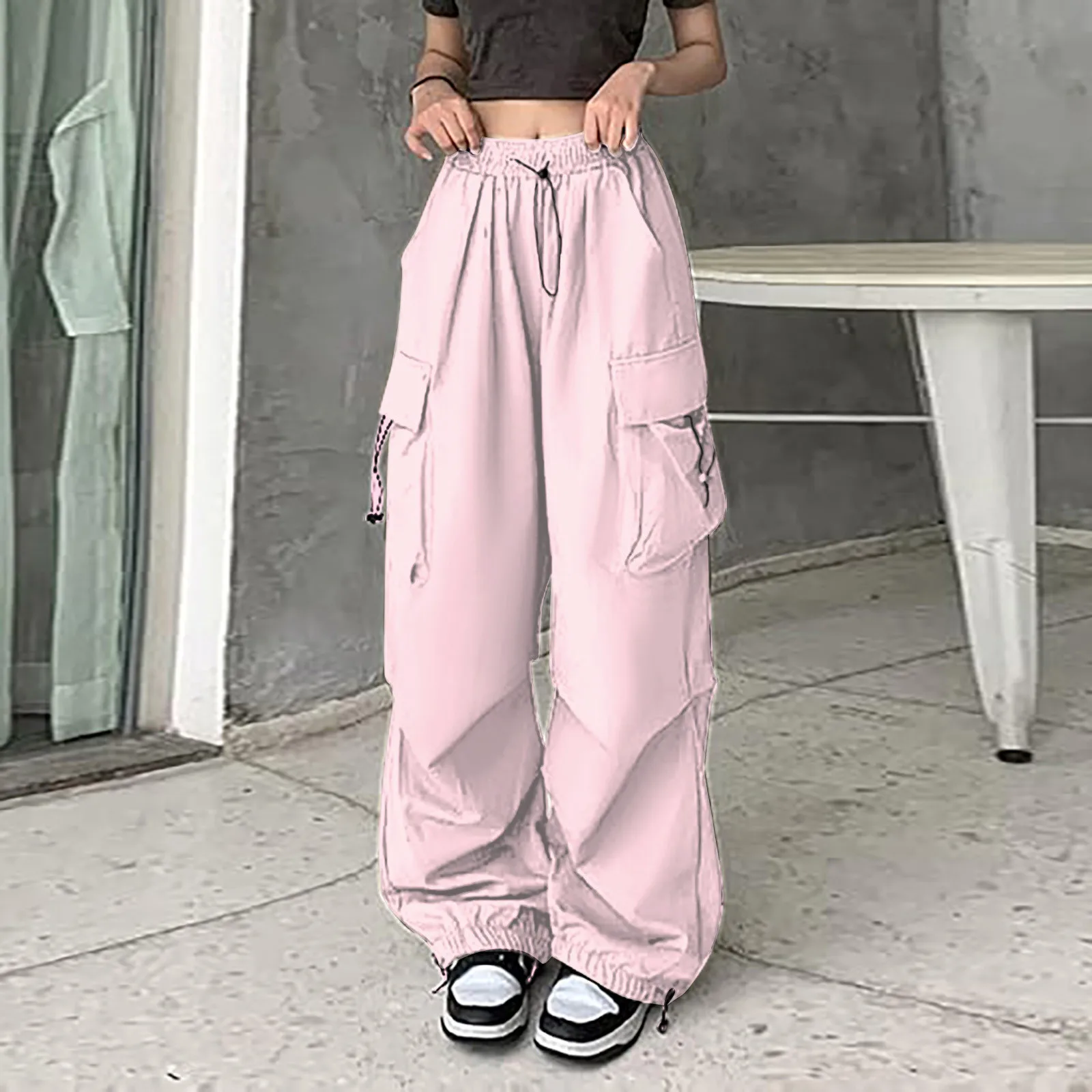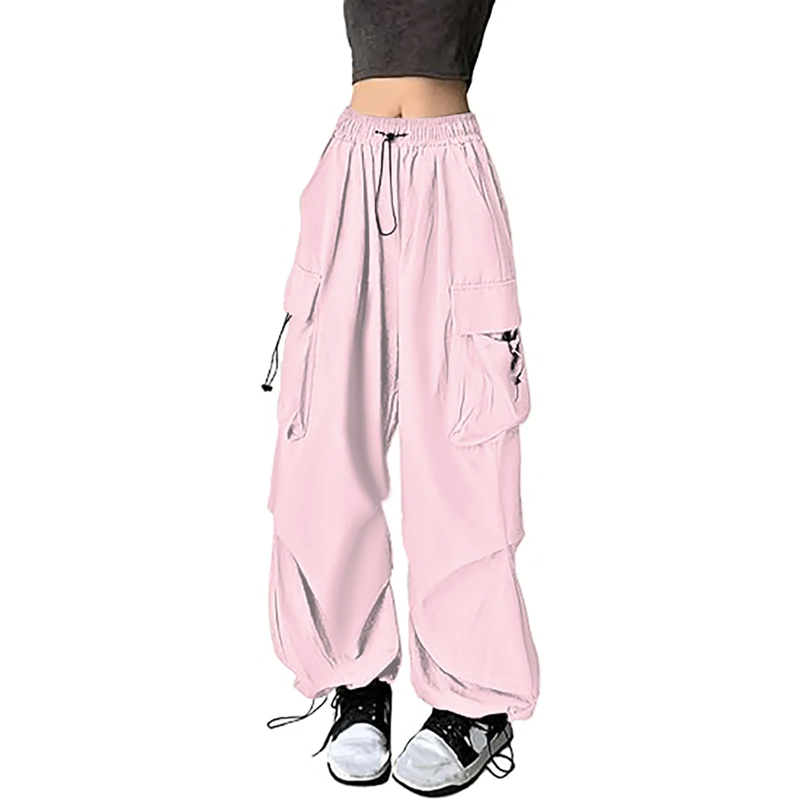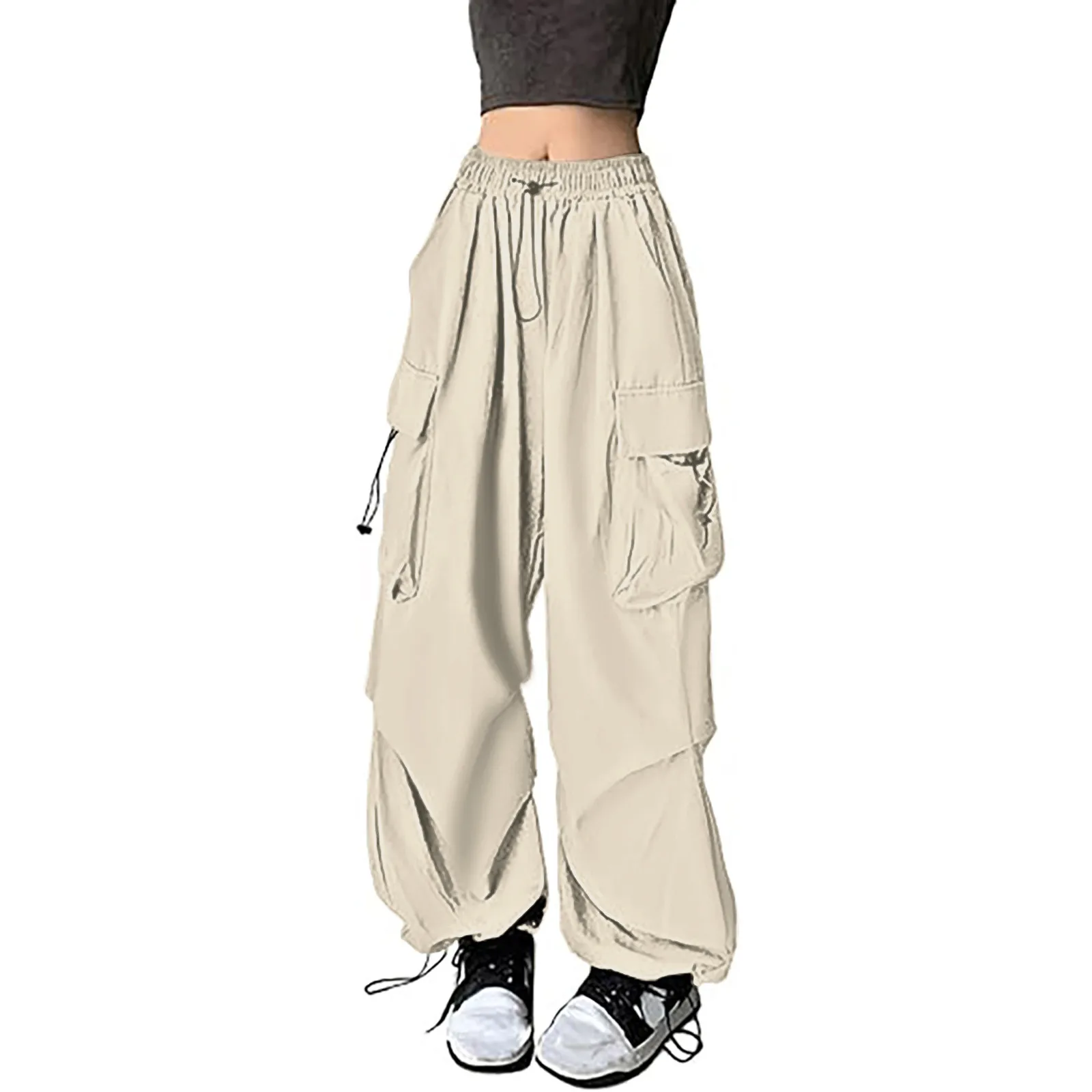 Womens Baggy Cargo Pants Streetwear Hip Hop Joggers Sweatpants Drawstring Casual Loose Solid Color Wide Leg Trousers