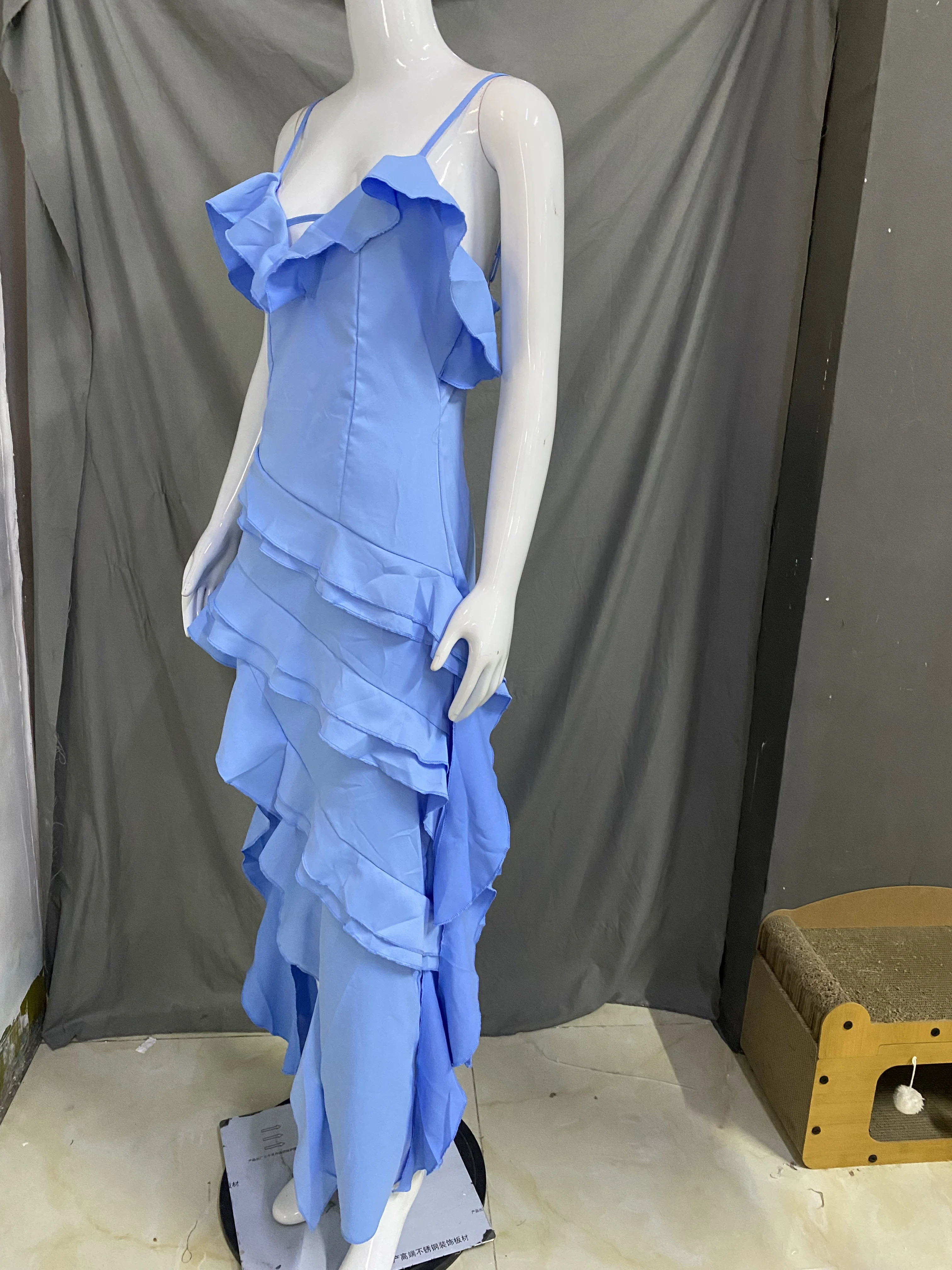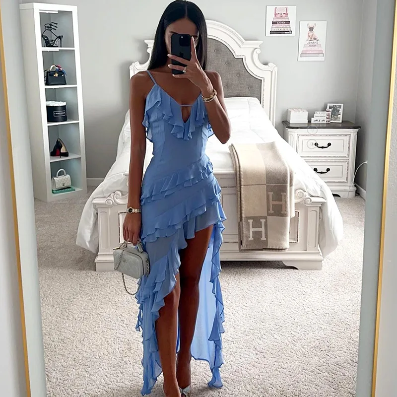 Women's dress solid color sexy suspender backless sleeveless irregular ruffle edge dress formal dress