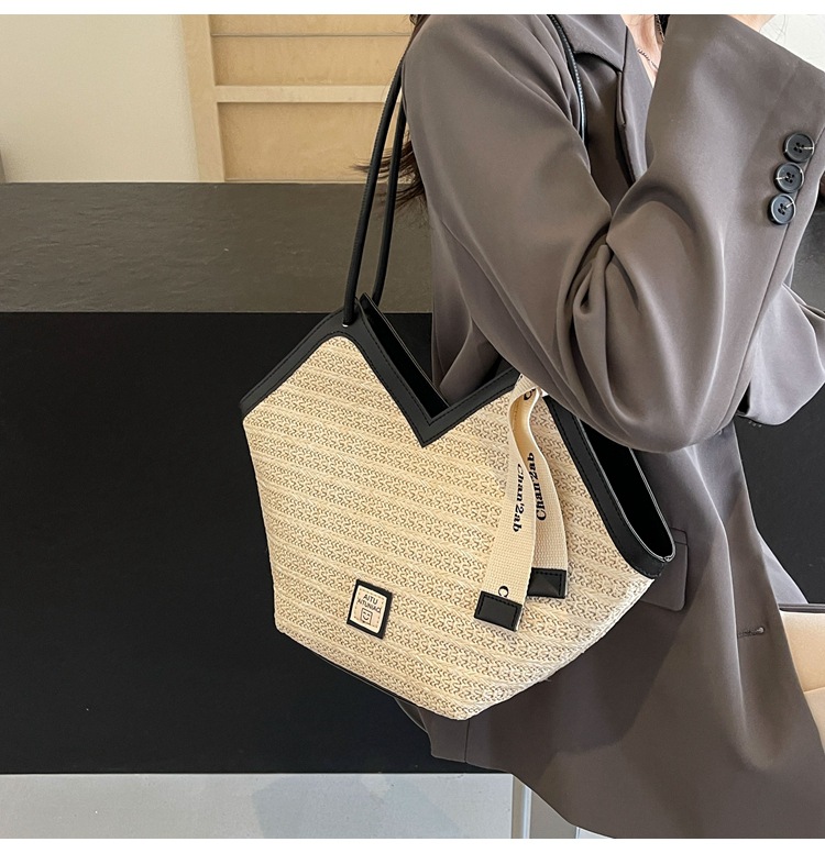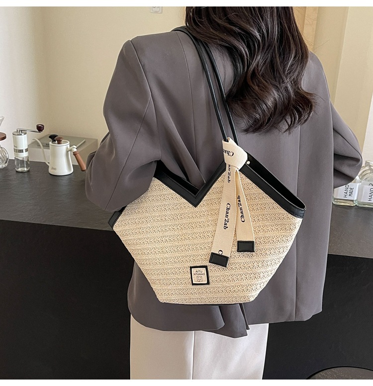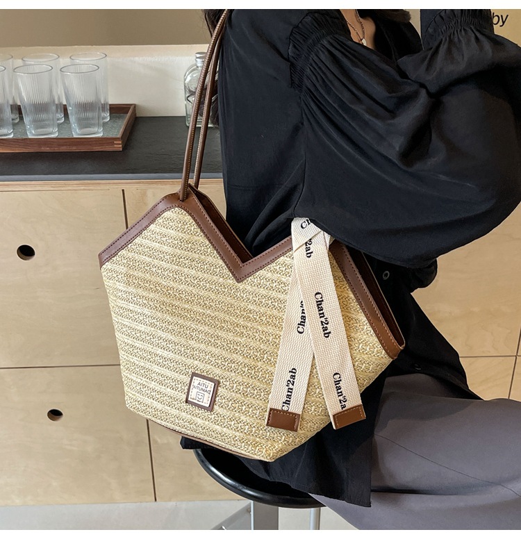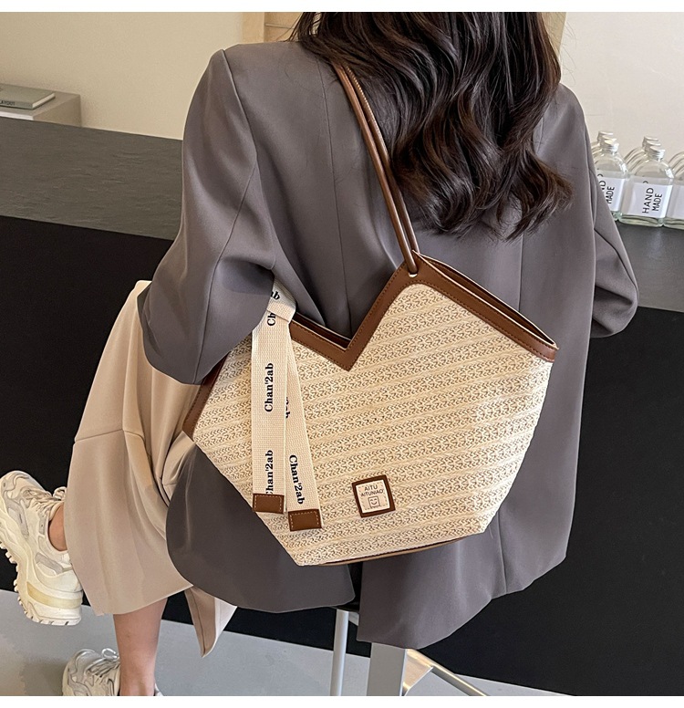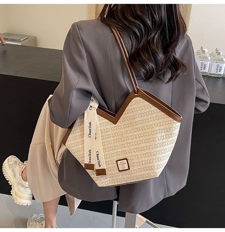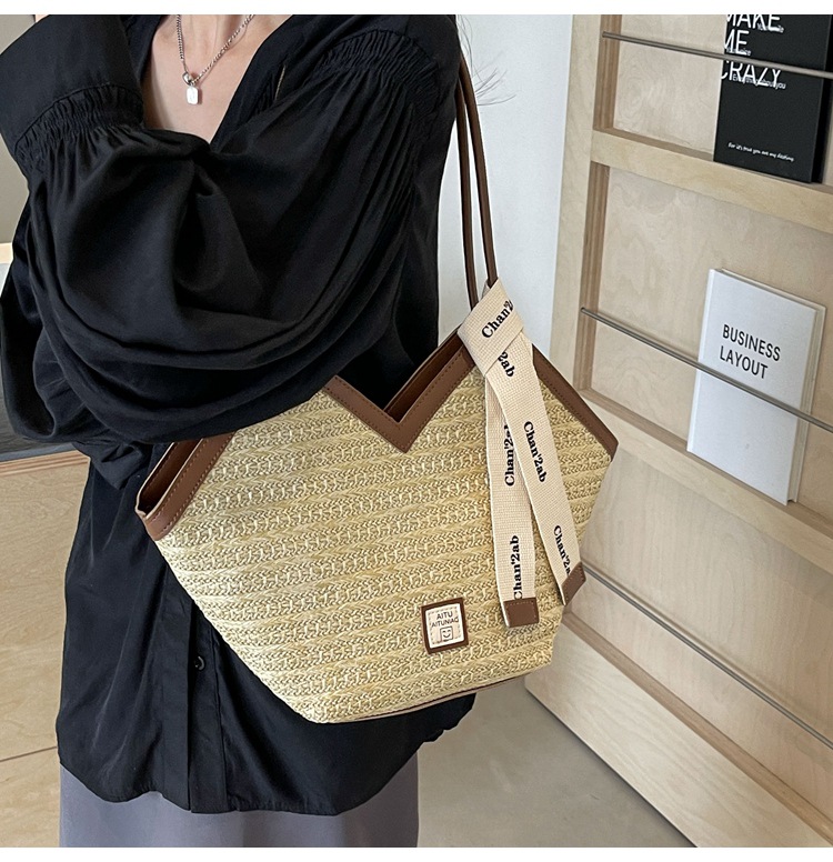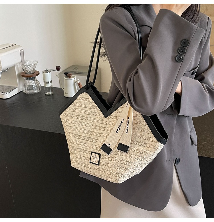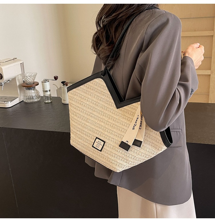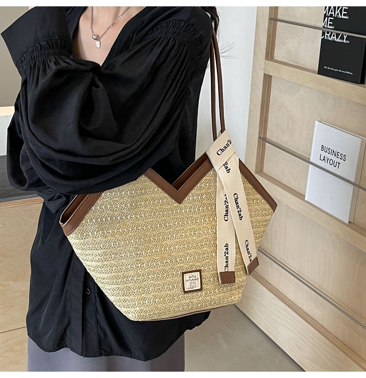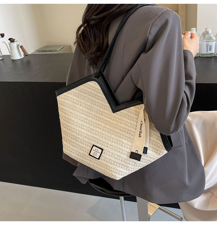 Woven Straw Woven Bag Women's Large Capacity 2025 New Arrival Easiest for Match Seaside Shoulder Bag Beach Vacation Commuter Tote