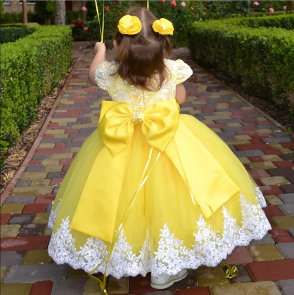 Yellow Flower Girl Dresses For Wedding Tulle White Appliques With Bow Cute Toddler Birthday Party Photo Shoot Gown